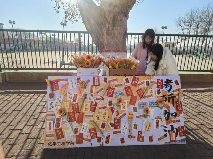 活动中,低年级同学自发参与,精心绘制励志展板、手写祝福贺卡;学院也特别准备了寓意“一举夺魁”的向日葵花束。贺卡上,“笔锋所至,梦想花开”“披星戴月走过的路,终将繁华满地”等真挚话语,承载着全院师生对考研学子的深切鼓励与殷切期盼。