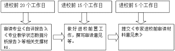 答:(1)进校前:专家在系统中查收专业及秘书提交的进校材料,审阅自评报告、数据分析报告,填写“专家进校前审读材料意见表”,于进校前一周在系统中提交。专家组长在系统中查看专家组成员提交的“专家进校前审读材料意见表”,拟定考察重点。