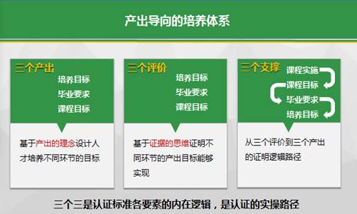 以产出为导向,就是强调以师范生的学习效果为导向,对照师范毕业生核心能力素质要求,评价师范类专业人才培养质量。关注师范毕业生“学到了什么” 和“ 能做什么”,而非仅仅是“教师教了什么”。要求专业按照“ 反向设计,正向施工”的基本思路,面向基础教育改革发展需求,以培养自标和毕业要求为出发点,设计科学合理的培养方案和课程大纲,采用匹配的教学内容和教学方法,配置足够的软硬件资源,要求每个教师明确自己在课程教学中的主体责任,最终通过课程目标、毕业要求和培养目标的定期评价和持续改进,保证师范毕业生核心能力素质要求的达成。