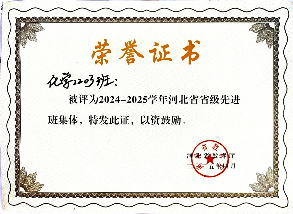 公司化学2203班以“志存高远,知行合一”为班训,荣获2024-2025学年“河北省省级先进班集体”称号。
